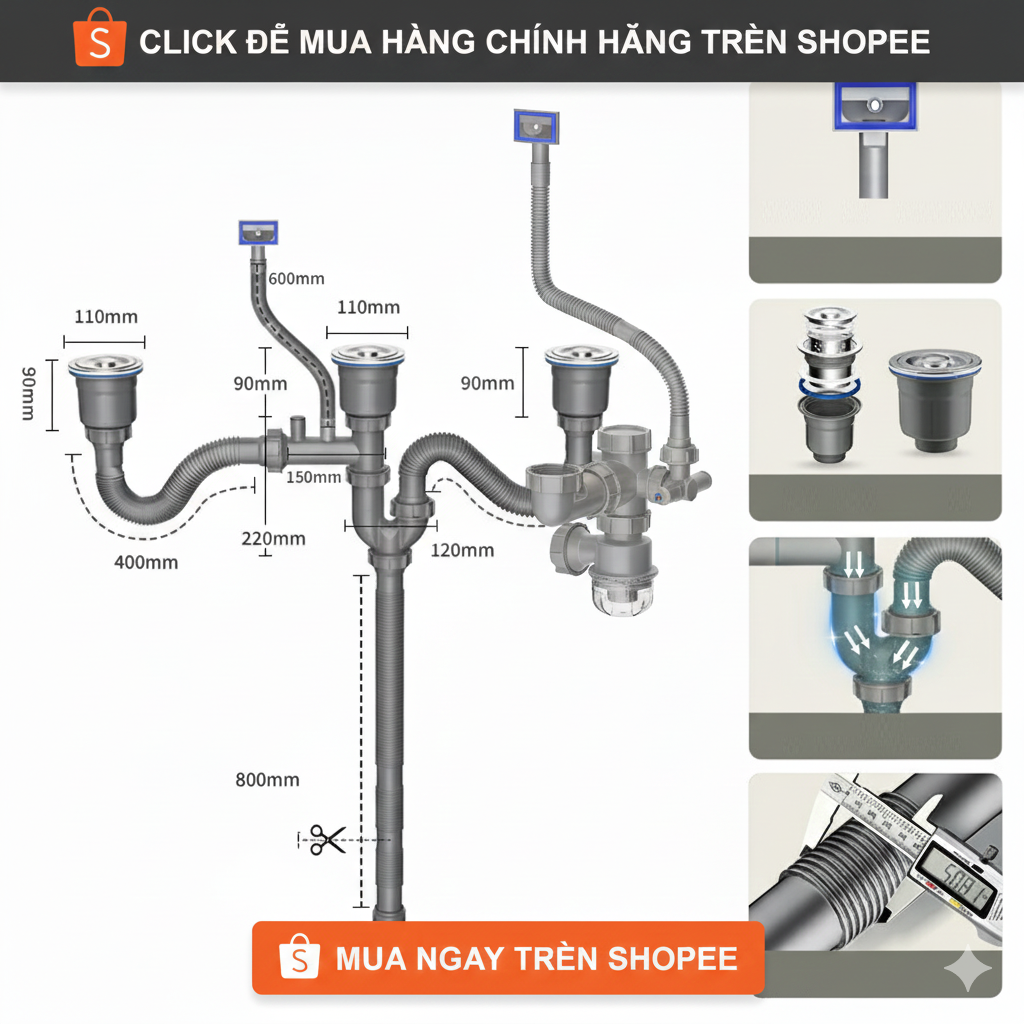 - Bộ xiphong thoát nước có chiều dài ống xả ruột gà cơ động từ đến 80 cm - cơ động giúp phù hợp với mọi không gian bên dưới bồn rửa bát