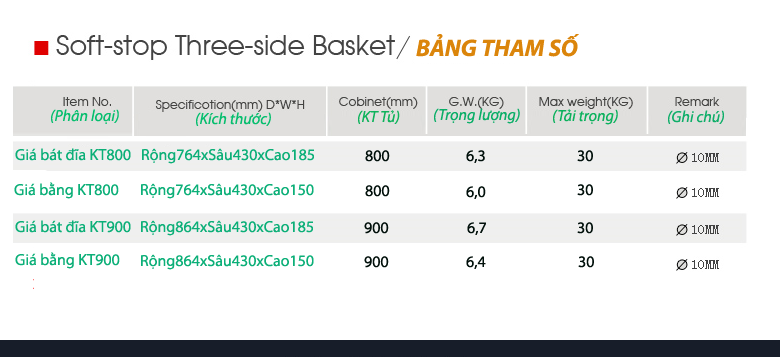 - Chất liệu: INOX304 cao cấp. - Các thanh Inox của kệ làm bằng Inox lõi đặc, không từ tính. - Khoảng cách giữa các thanh là 2,1cm, thiết kế chuẩn căn cứ vào lực tác động với các vật dụng nhà bếp - Độ dày thanh Inox chính là 10,25mm - tạo thành khung có độ chắc chắn chịu tải trọng 30Kg. - Công nghệ phủ: Phủ Inox sợi mịn hoàn hảo, chống ăn mòn, chống rỉ, chống xước, càng dùng càng sáng. - Giá xong nồi, bát đĩa được thiết kế rộng, phù hợp với đa dạng các chủng loại vật dụng khác nhau. - Thanh ray giảm chấn giúp đóng tủ khít và nhẹ nhàng hơn - tránh va chạm mạnh