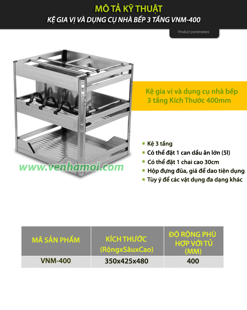 + Loại VNM-400: Kích thước 400mm, Kệ 3 tầng kèm thanh ray giảm chấn