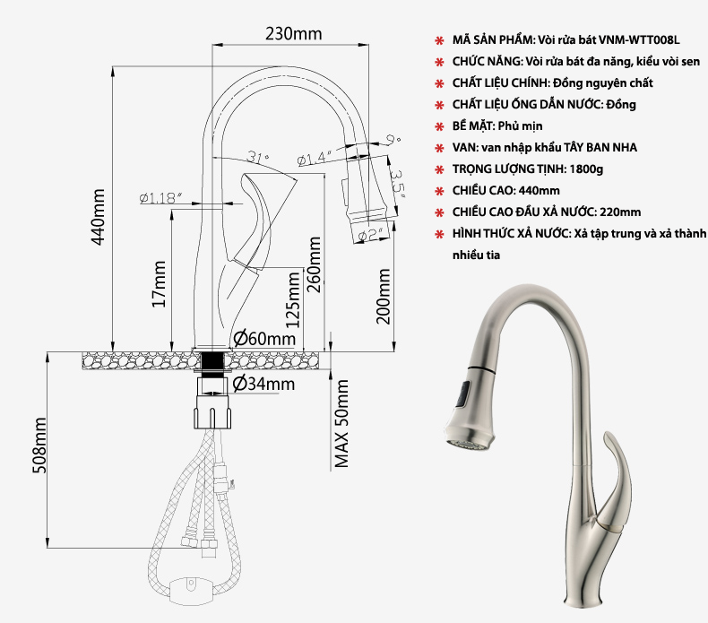 Vòi rửa bát có chức năng nóng lạnh vàchức năng rút đầu vòi với ống dẫn nước vòi sen dài 60cm, thuận tiện khi sử dụng. |