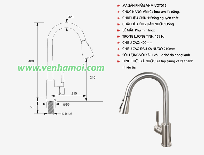 + Loại VNM-VQY016 : Vòi rửa hoa sen đa năng lõi đồng nguyên chất phủ Inox 3 lớp |